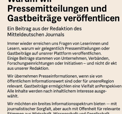 Ein Beitrag aus der Redaktion des Mitteldeutschen Journals Immer wieder erreichen uns Fragen von Leserinnen und Lesern, warum wir gelegentlich Pressemitteilungen oder Gastbeiträge auf unserer Plattform veröffentlichen. Einige Beiträge stammen von Unternehmen, Verbänden, Forschungseinrichtungen oder Initiativen – und nicht direkt…